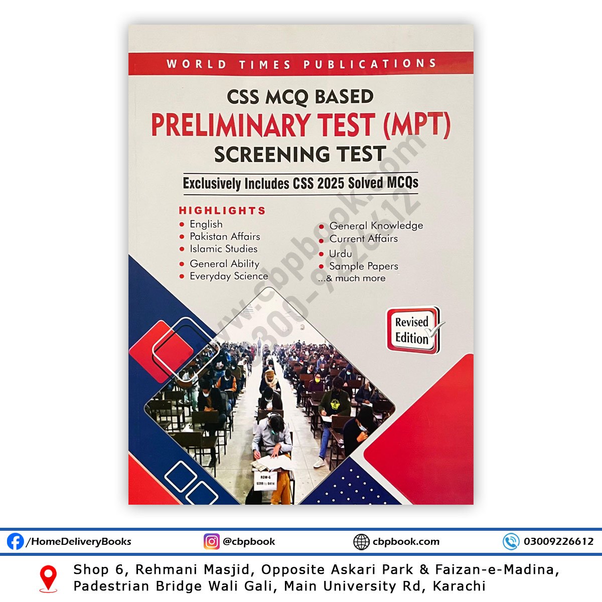 Get exam-ready with the CSS MCQ-Based Preliminary Test (MPT) Screening Test – 2025 Edition, exclusively published by Jahangir’s World Times Publications. This updated and comprehensive guide is specially designed for the CSS Screening Test 2025, featuring solved MCQs, subject-wise coverage, and sample papers based on the latest FPSC pattern.